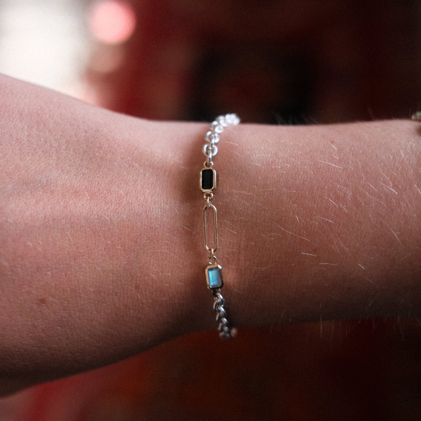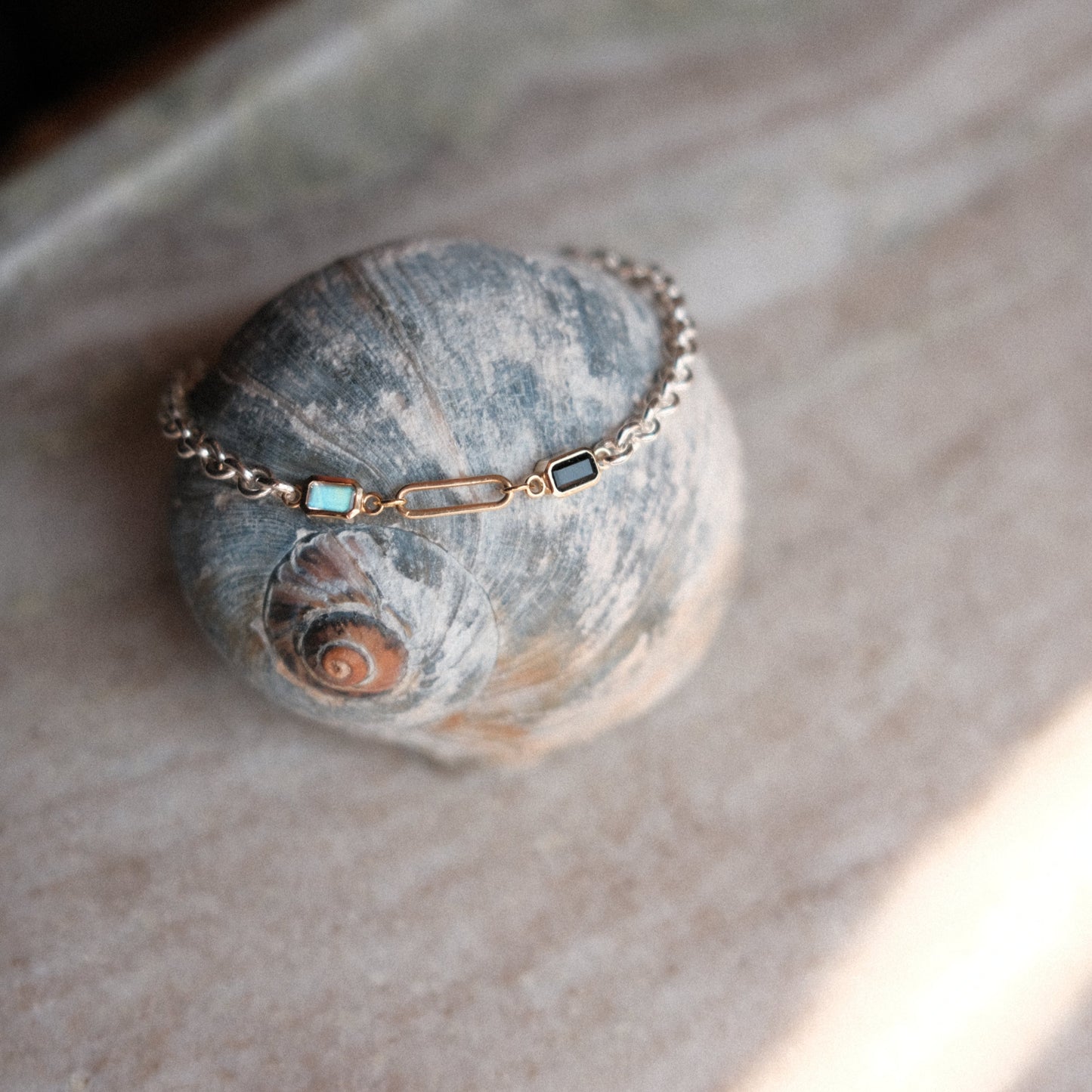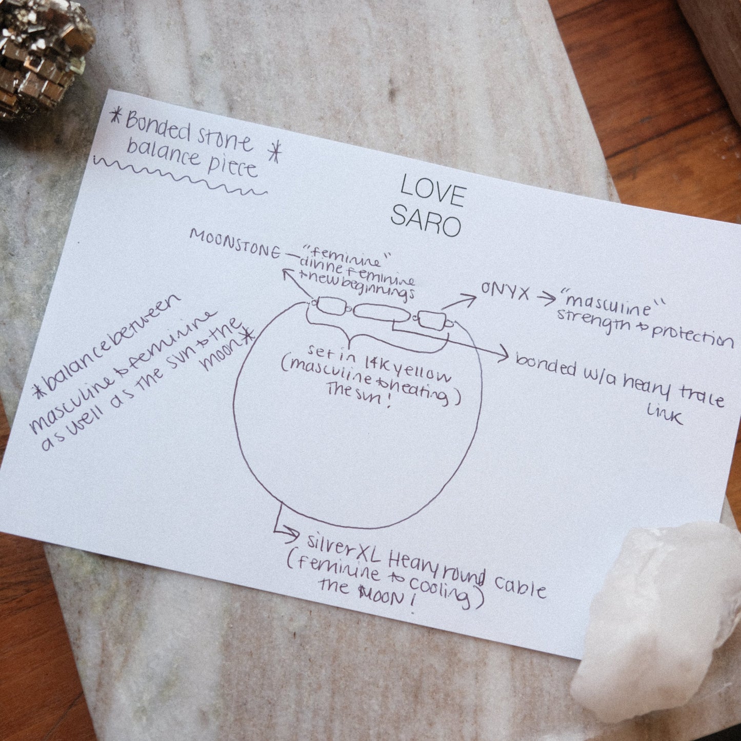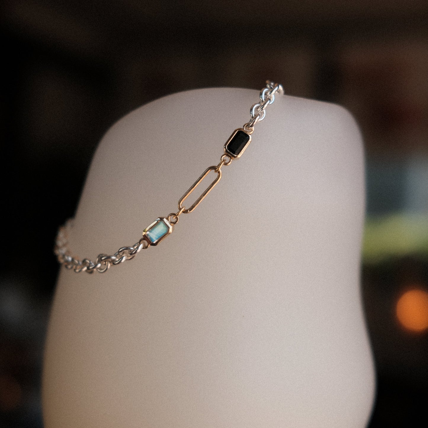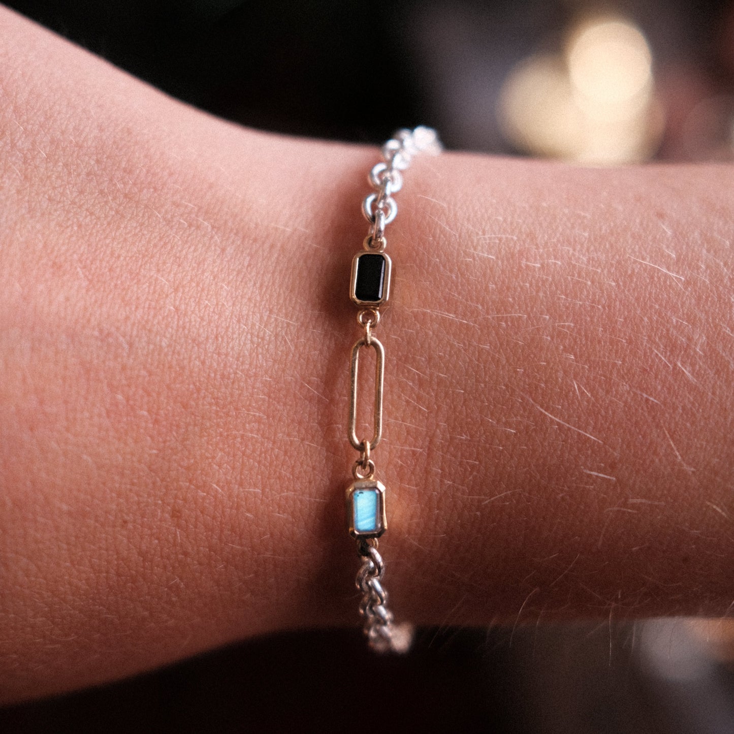 A powerful combination of natural Moonstone and natural Onyx, symbolizing balance between intuition and strength and the masculine and the feminine. Crafted in a mixed-metal design with solid 14k yellow gold and solid sterling silver to enhance the piece’s dual energy. Designed for both beauty and intention.