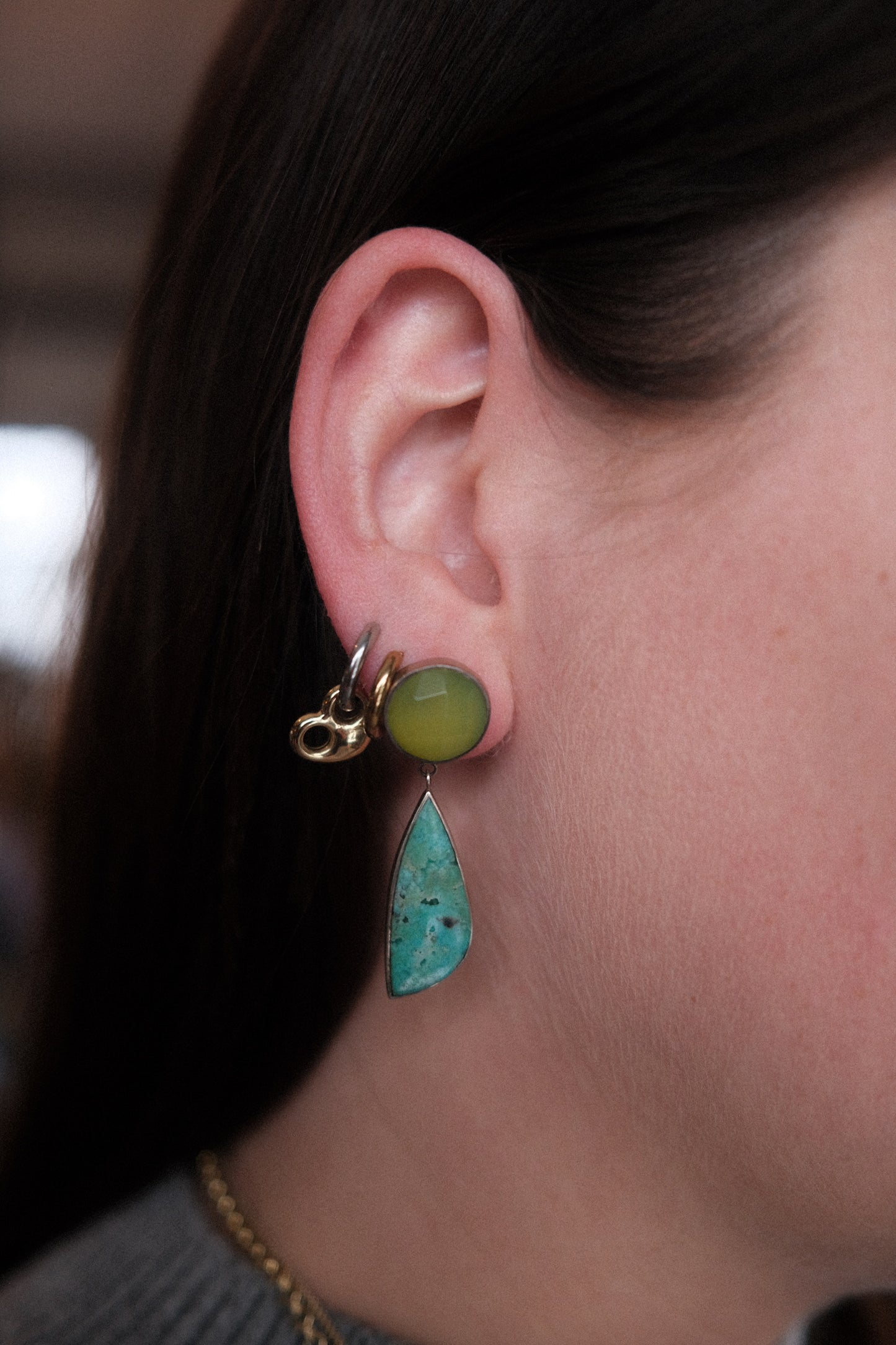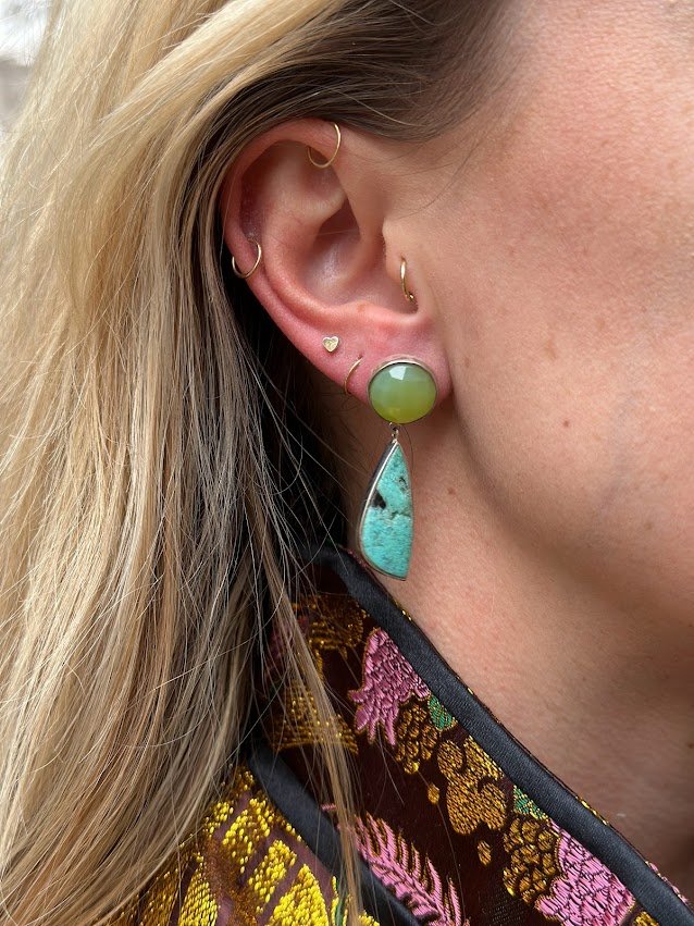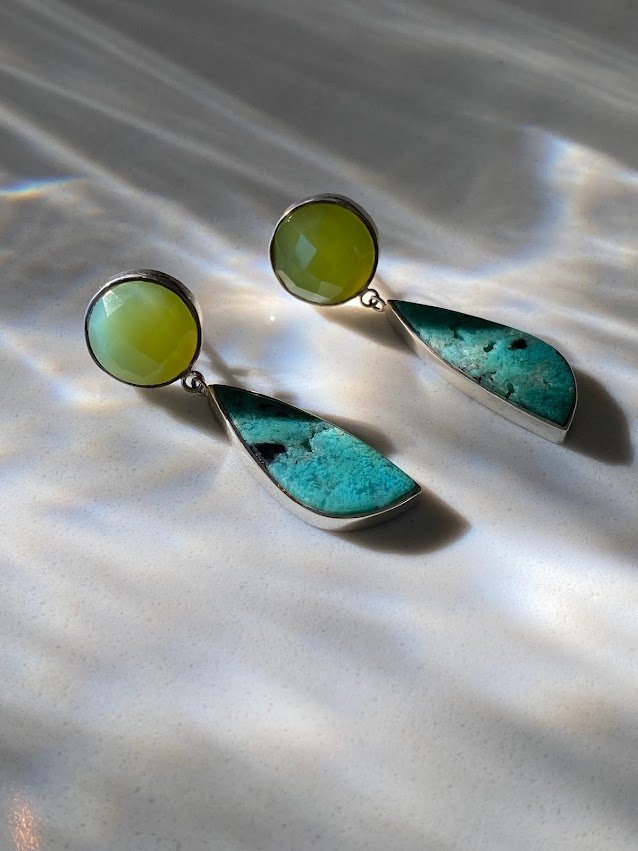 Created specially for Love Saro… These earrings feature Chrysoprase and Blue Chrysocolla Wood set in 925 Sterling Silver.