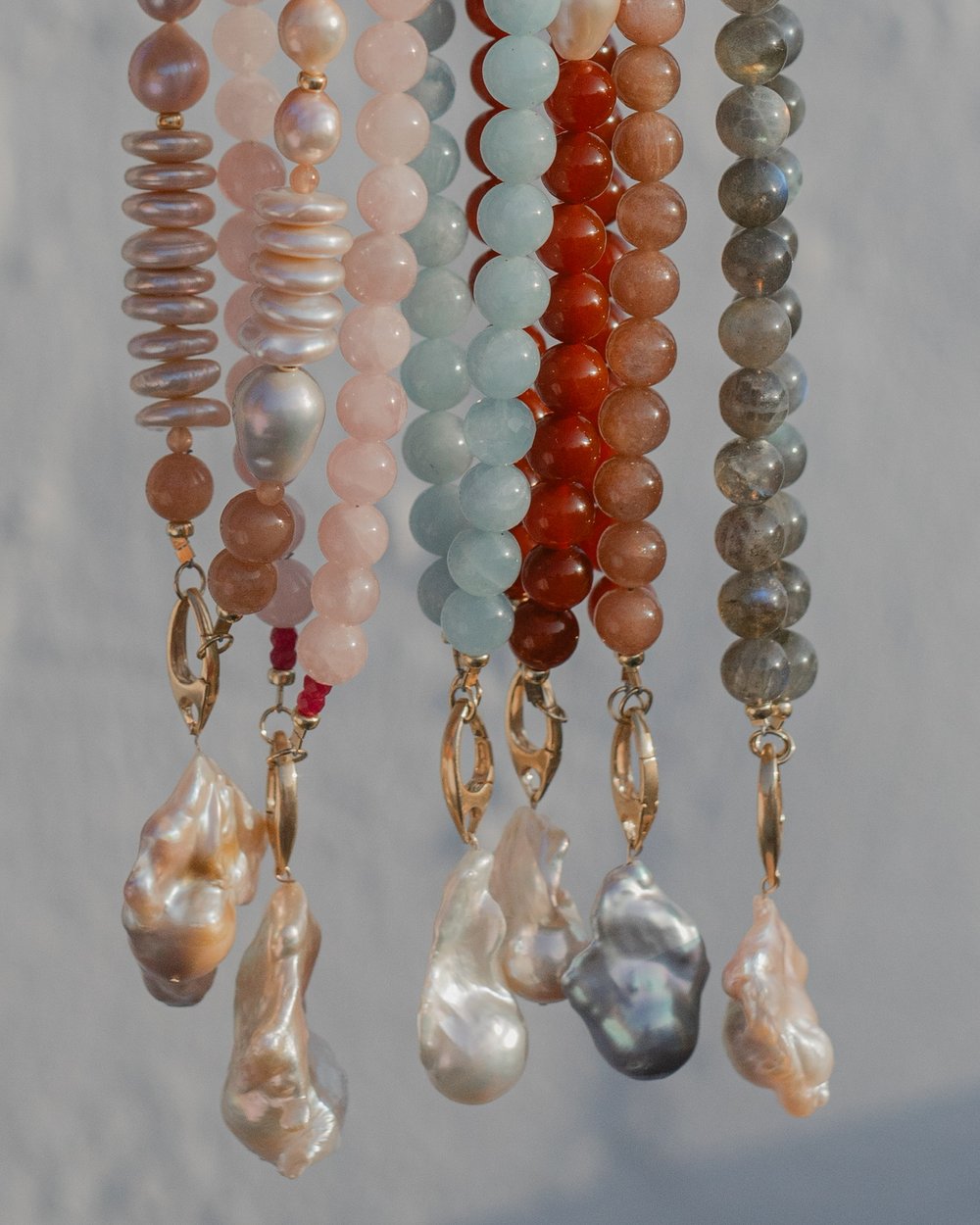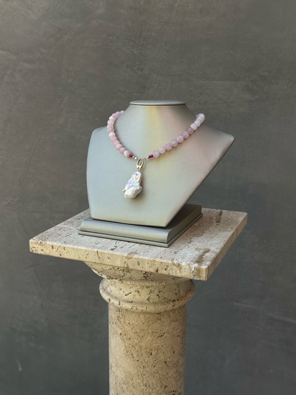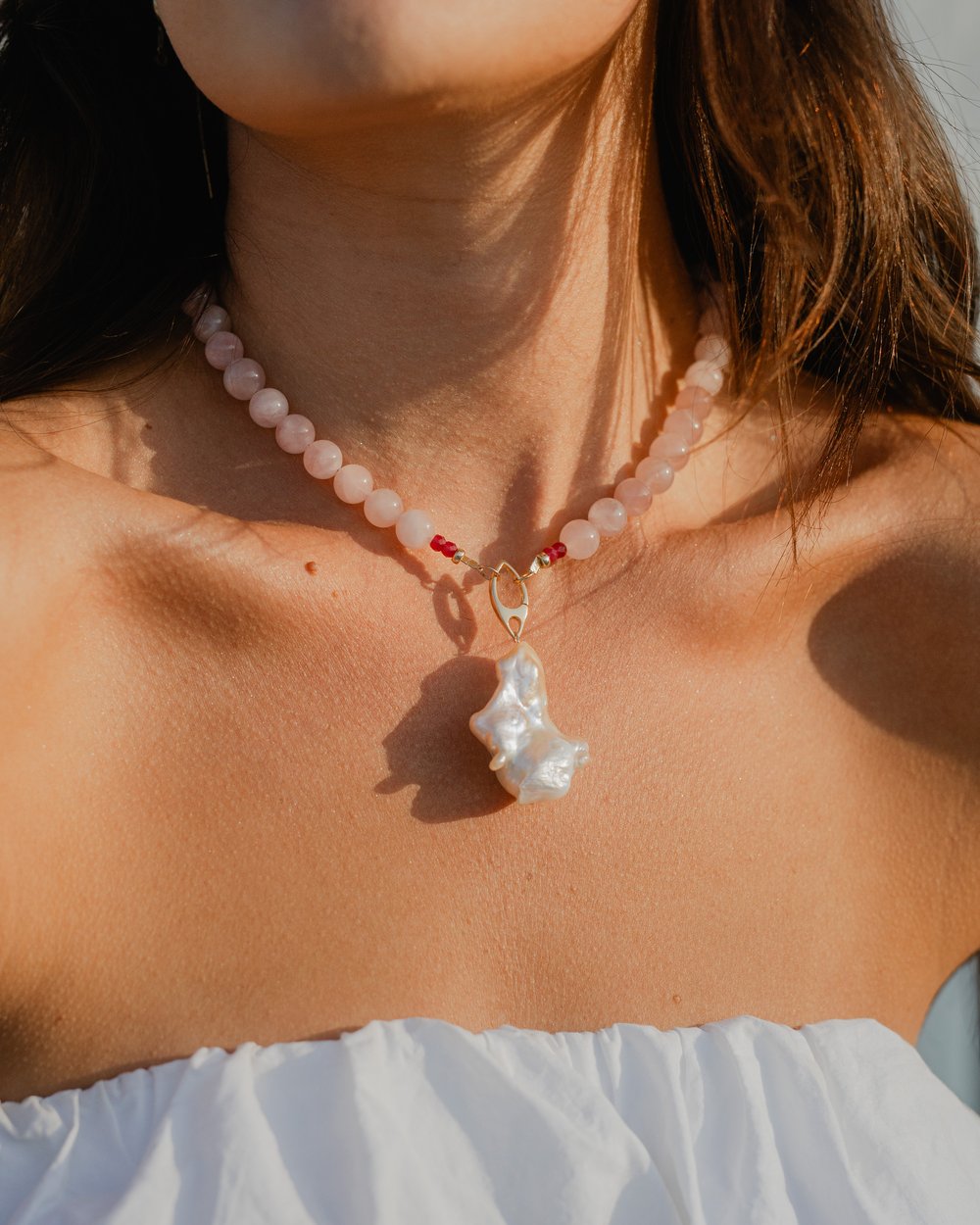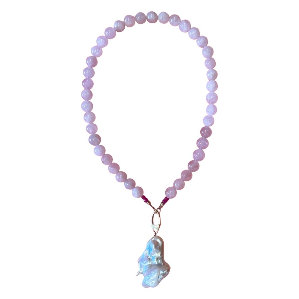 Our Pearl in Love Necklace features natural Rose Quartz beads for heart-centered energy, accented with Rubies to spark passion. Finished with your choice of a silver, golden, or white baroque pearl pendant—each one uniquely formed by nature. A piece designed to speak to the heart and be worn close to it.