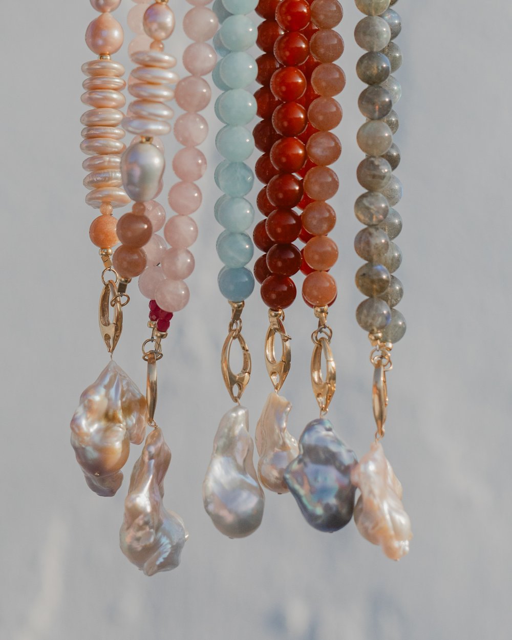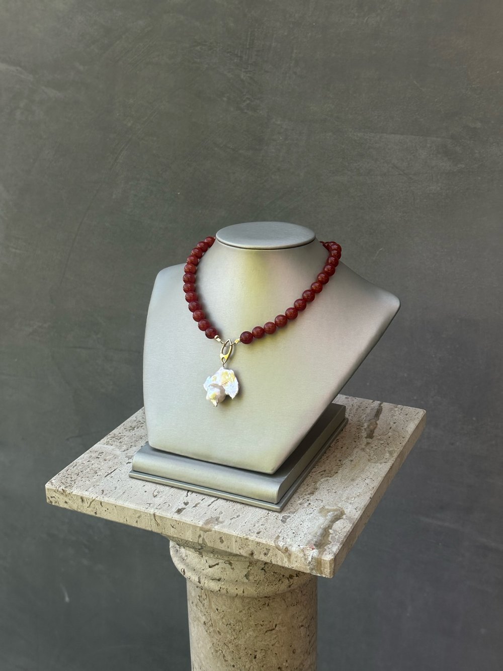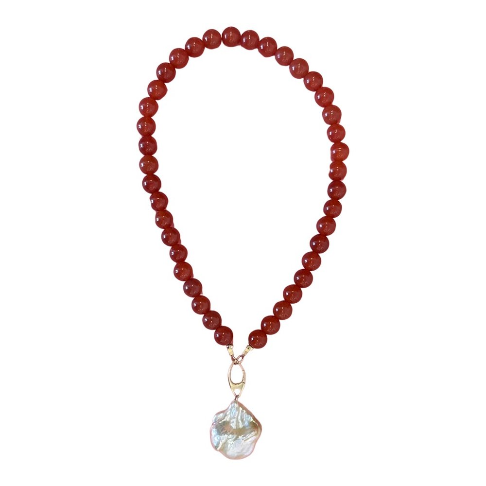 Our Pearl in Vitality necklace is designed with stunning natural Red Agate beads and a natural baroque pearl pendant.