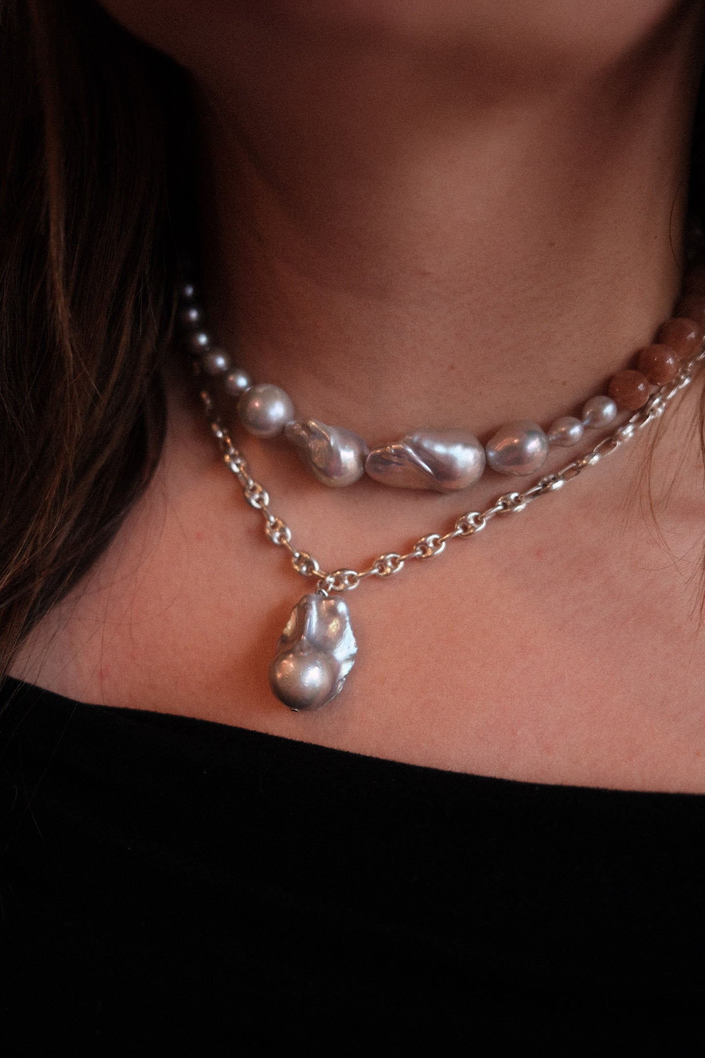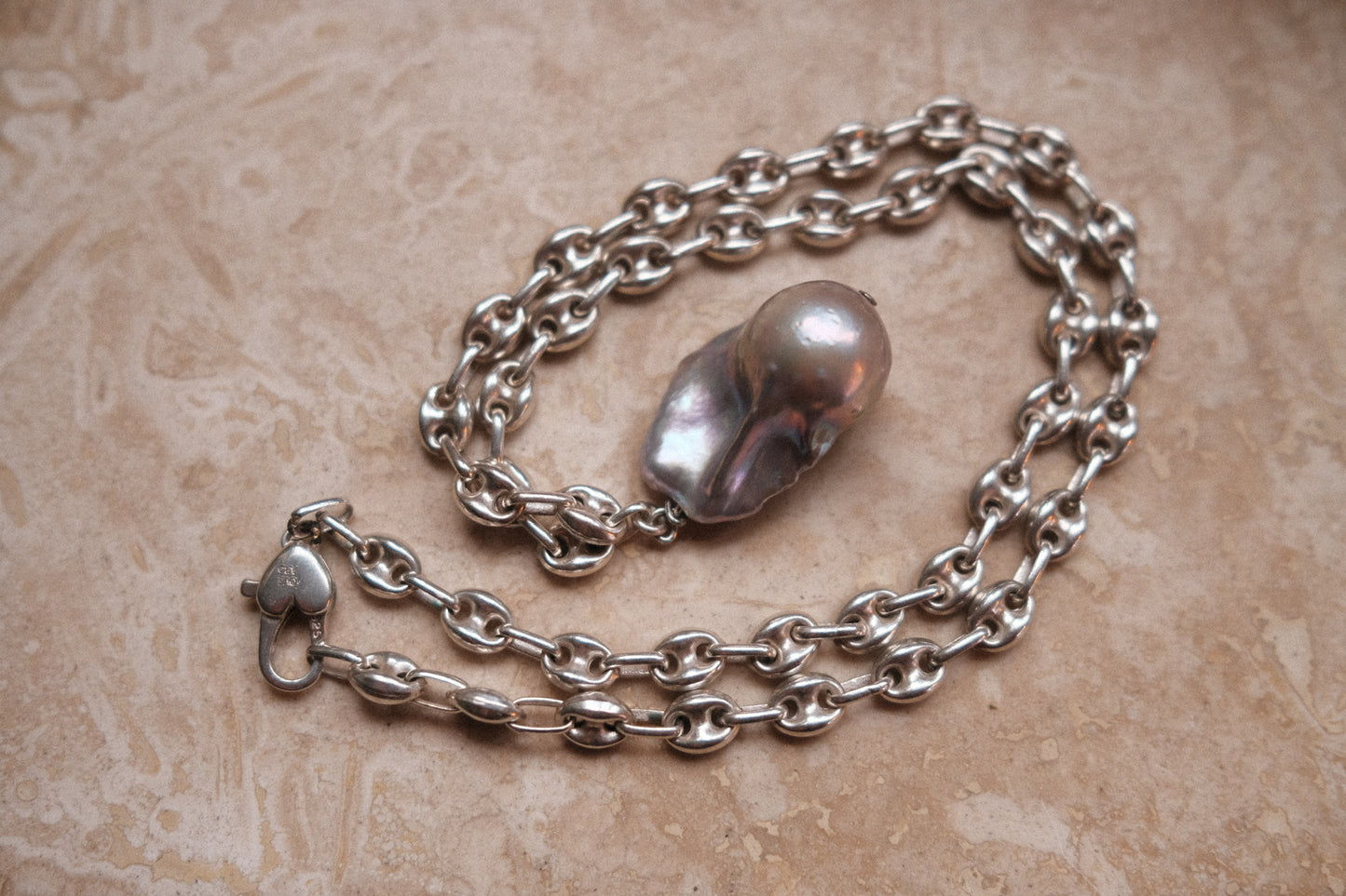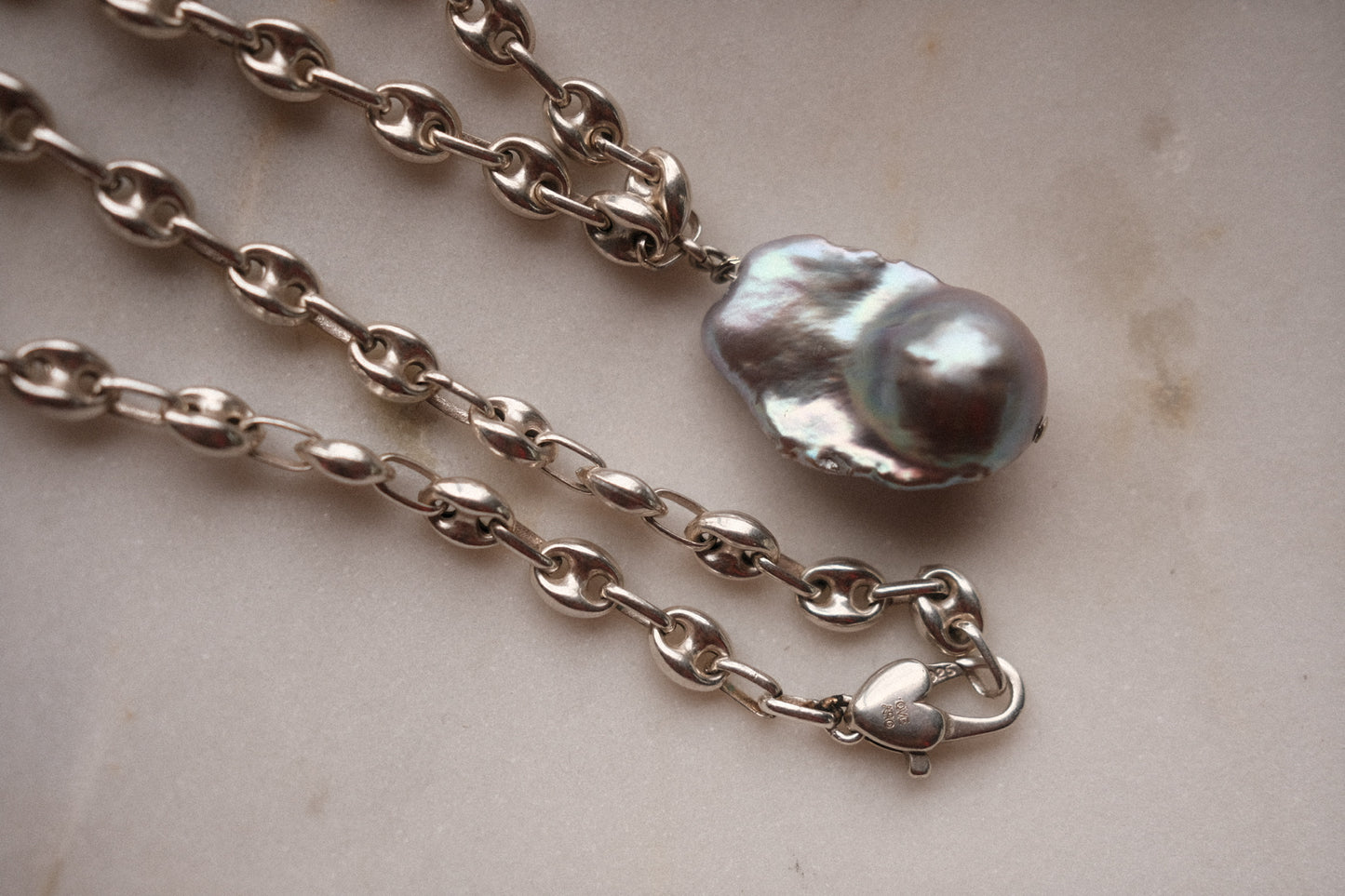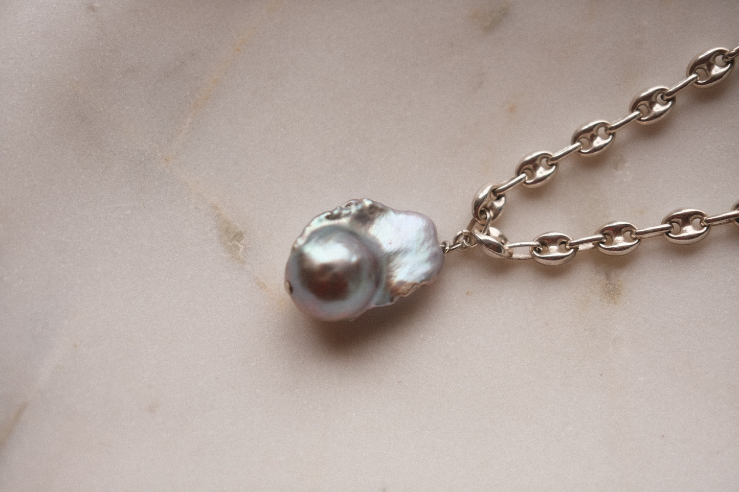A delicate balance of strength and softness, Pearl De Lune features a luminous baroque pearl suspended from a fine silver chain - like a moon floating in a quiet sky. It is the perfect statement pearl necklace to add to your collection.