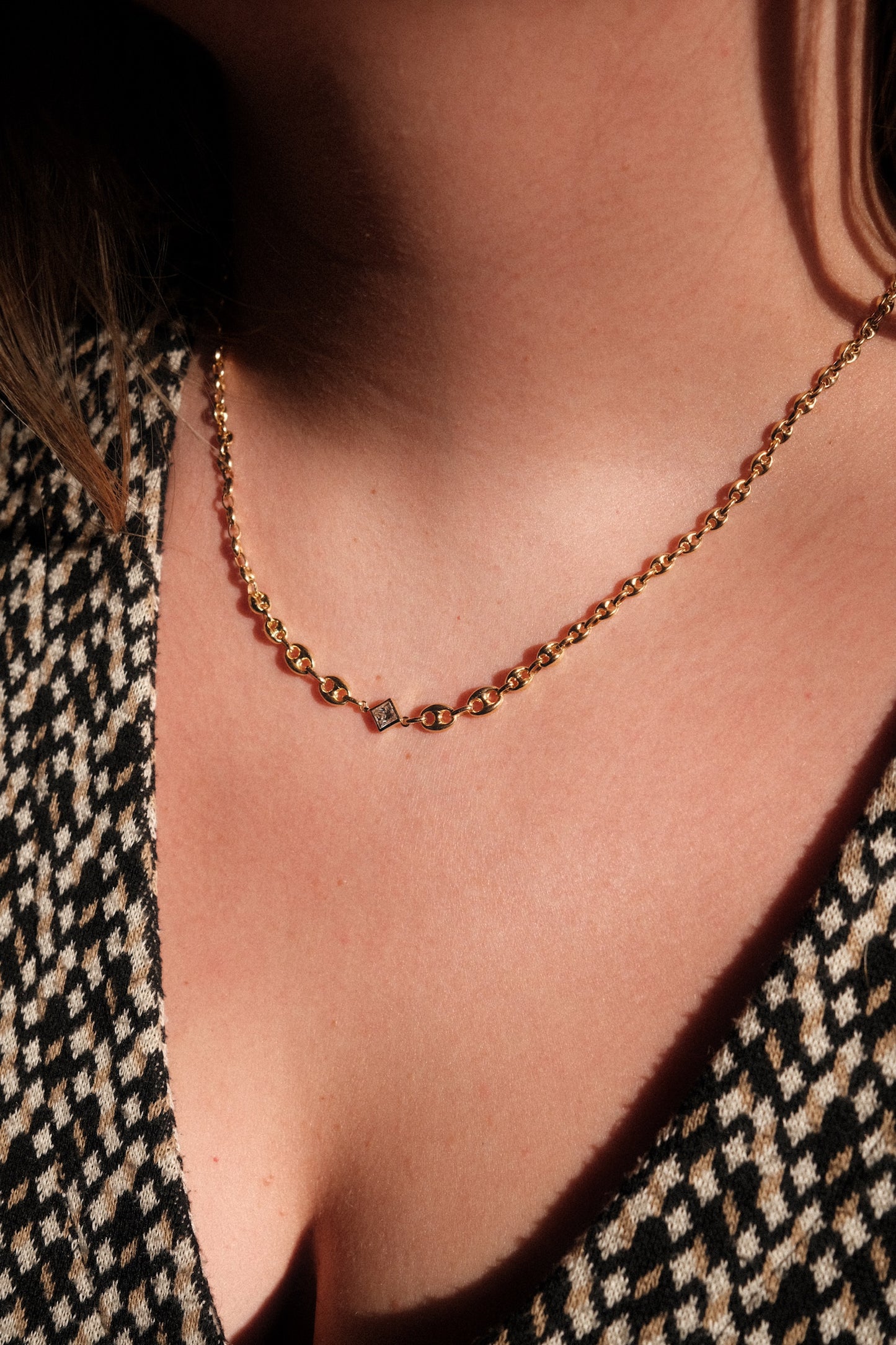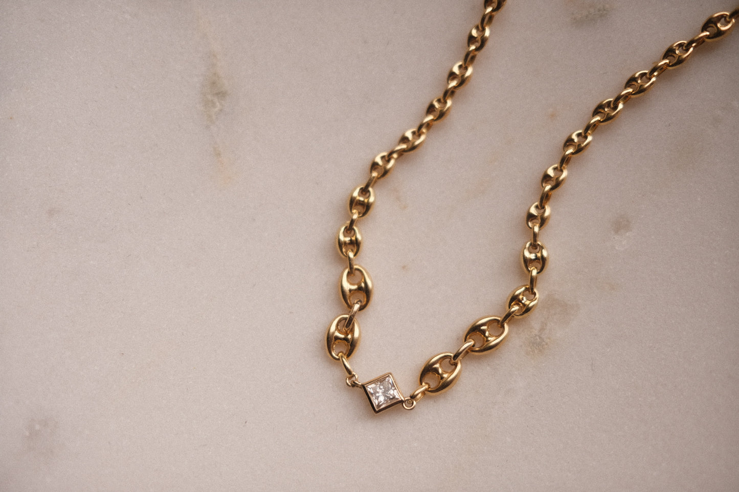 Our Diamond in Gradient Gucci Necklace showcases a striking 4mm princess-cut diamond, set in our bezel-set tilted square design—all crafted in solid 14k yellow gold. It hangs from our custom gradient Gucci chain, also in solid 14k gold, offering a bold yet refined take on luxury jewelry.