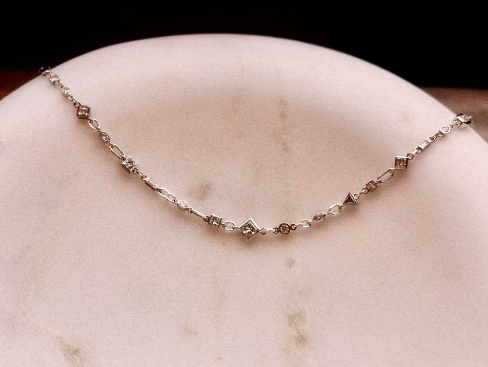 The diamonds are set in solid 14k white gold and paired with solid sterling silver chain links. Finished with a discreet 14k white gold clasp.