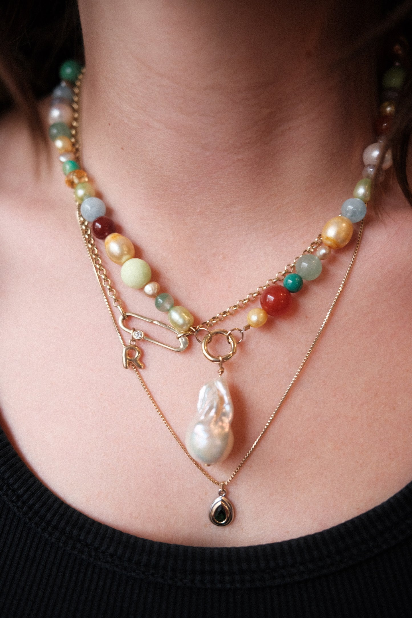 The Charmed Pearl features a vibrant mix of natural stones and a single golden baroque pearl. This pearl uniquely hangs from our Round Charm Clasp. Designed to be interchangable with other charms. This is the perfect piece to elevate your daily stack.
