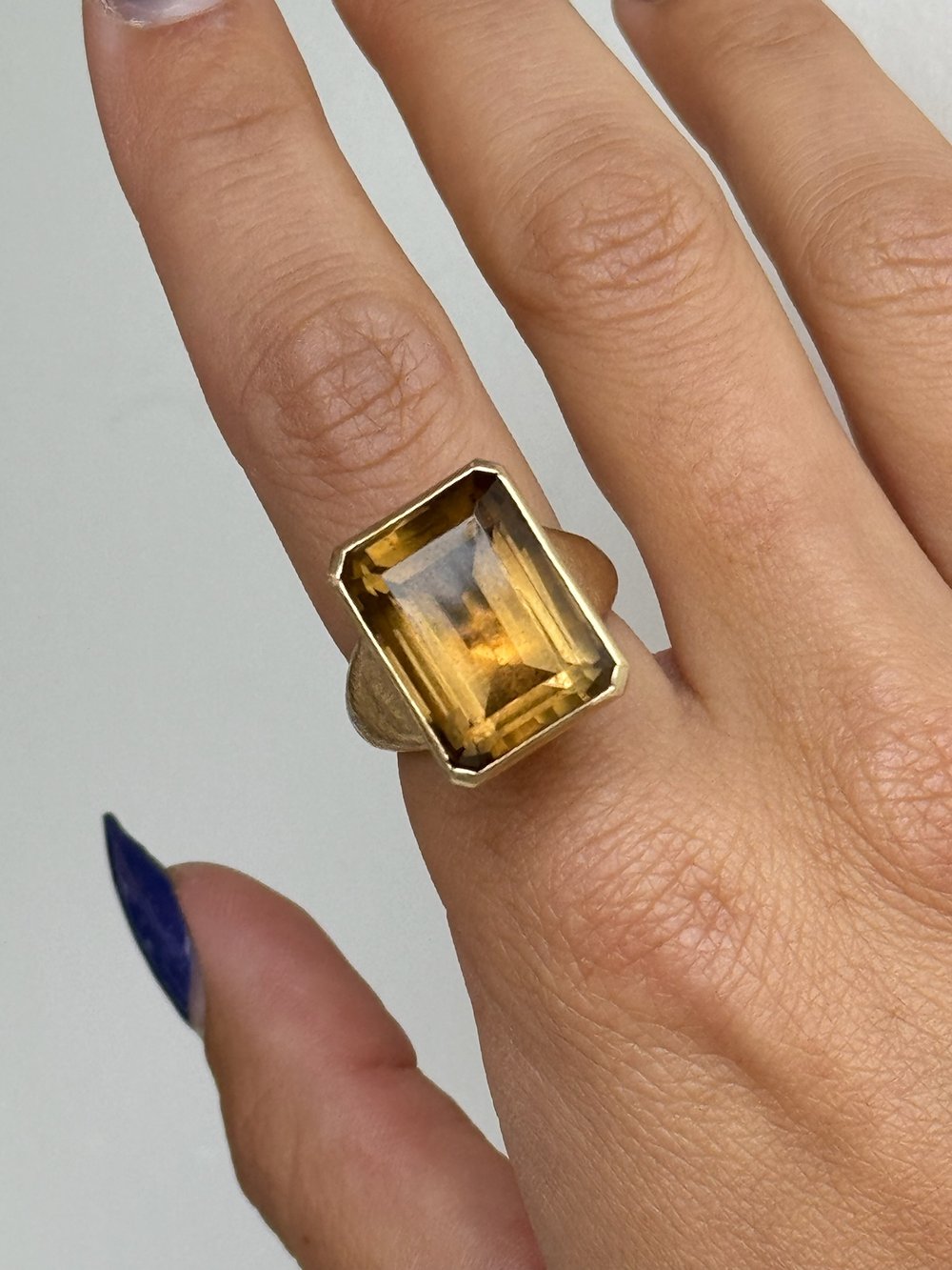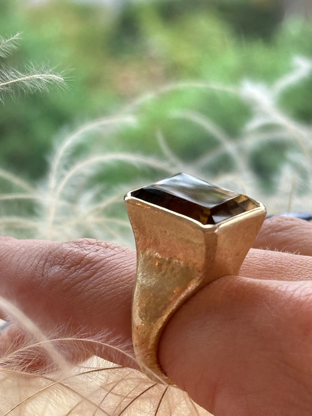 Striking and sophisticated, this one-of-a-kind cocktail ring features a stunning 16-carat Smoky Citrine, glowing with rich, golden-brown tones. The bold gemstone is set in a hammered solid 14k yellow gold band, adding texture, warmth, and a touch of artisanal elegance. A true statement piece—designed to stand out and be treasured for years to come.