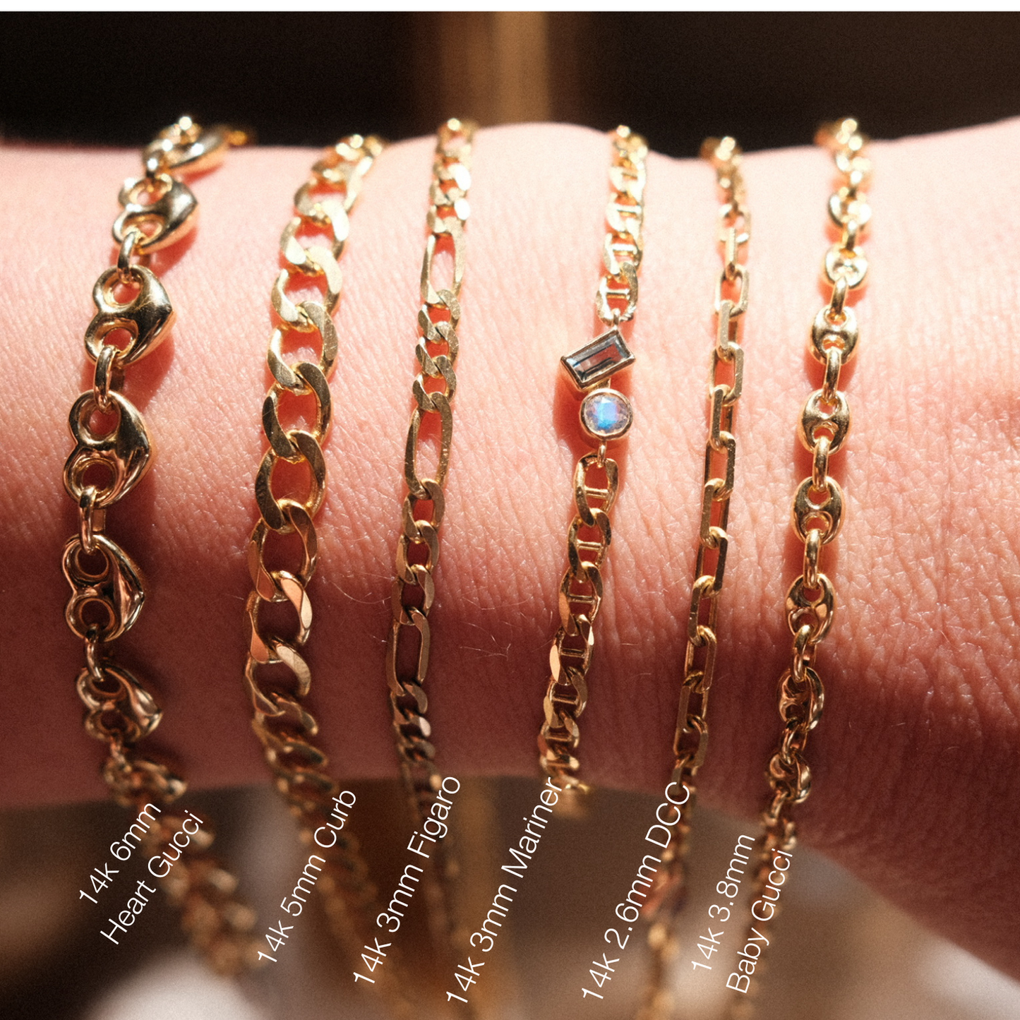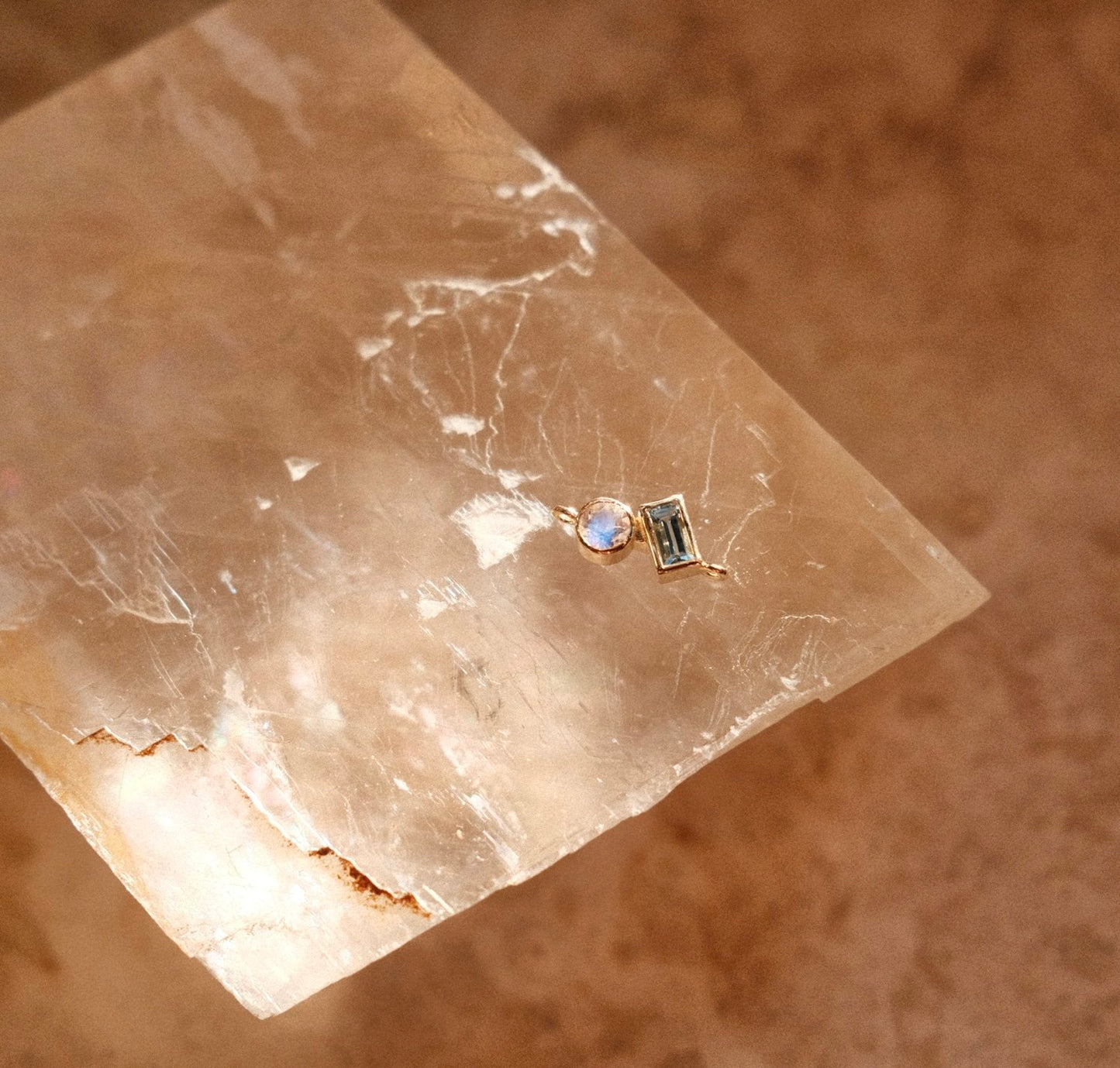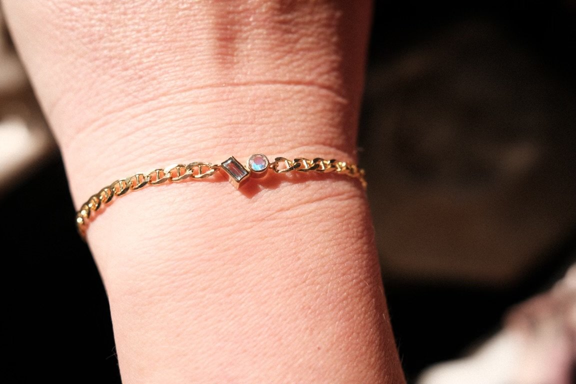 The "HEAL IN FERTILITY" bracelet features our Aquamarine and Moonstone Toi et Moi charm. Both genuine gemstones are bezel-set in solid 14k yellow gold and designed in your choice of one of six solid gold chain styles.