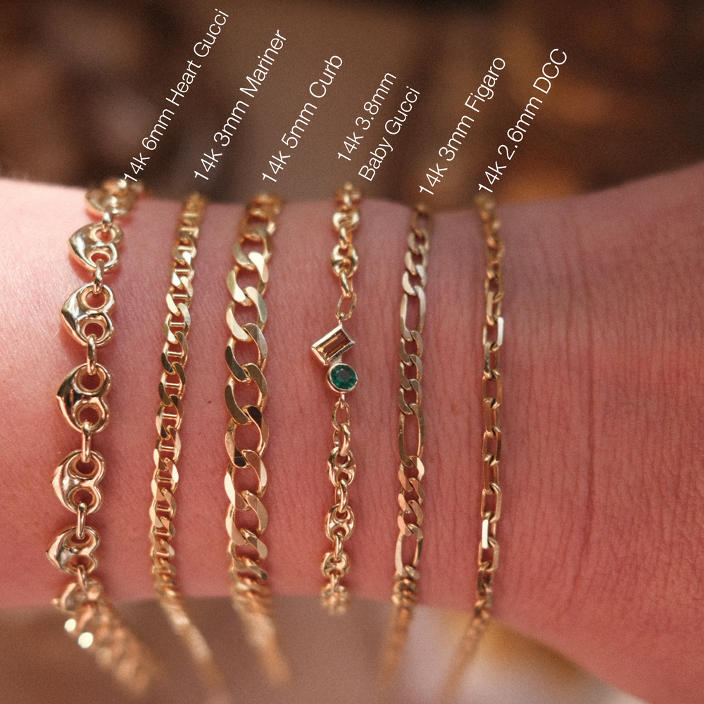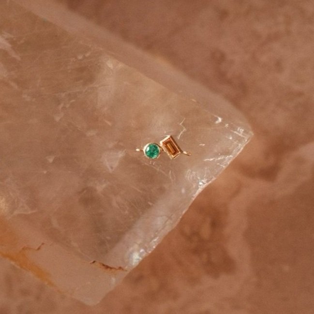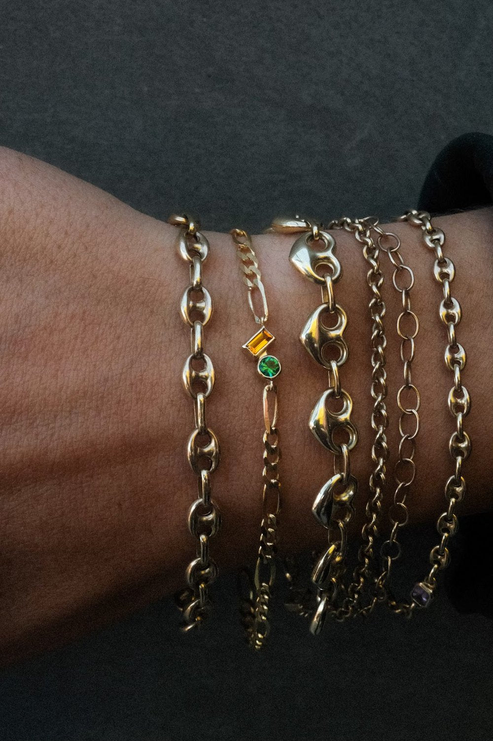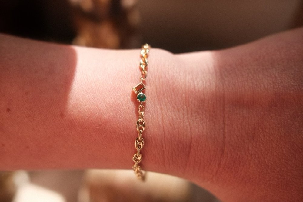 The "HEAL IN COURAGE" bracelet features our Emerald and Citrine Toi et Moi charm. Both genuine gemstones are bezel-set in solid 14k yellow gold and designed in your choice of one of six solid gold chain styles.